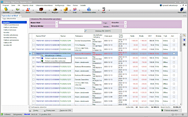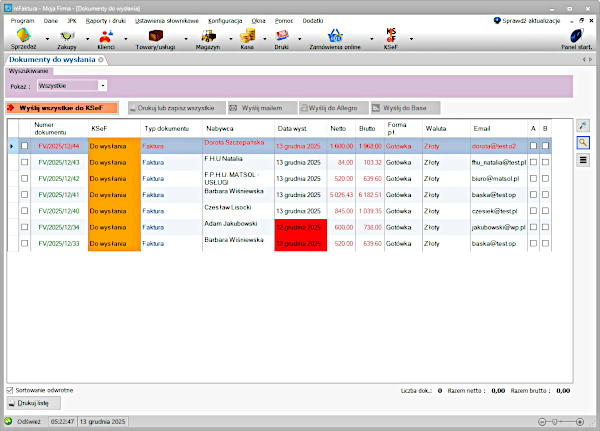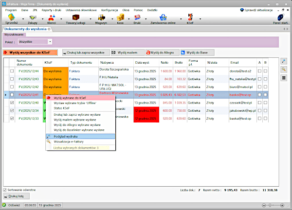- po wysłaniu dokumentów do KSeF można je łatwo wysłać grupowo lub pojedynczo mailem, wydrukować, zapisać do pdf