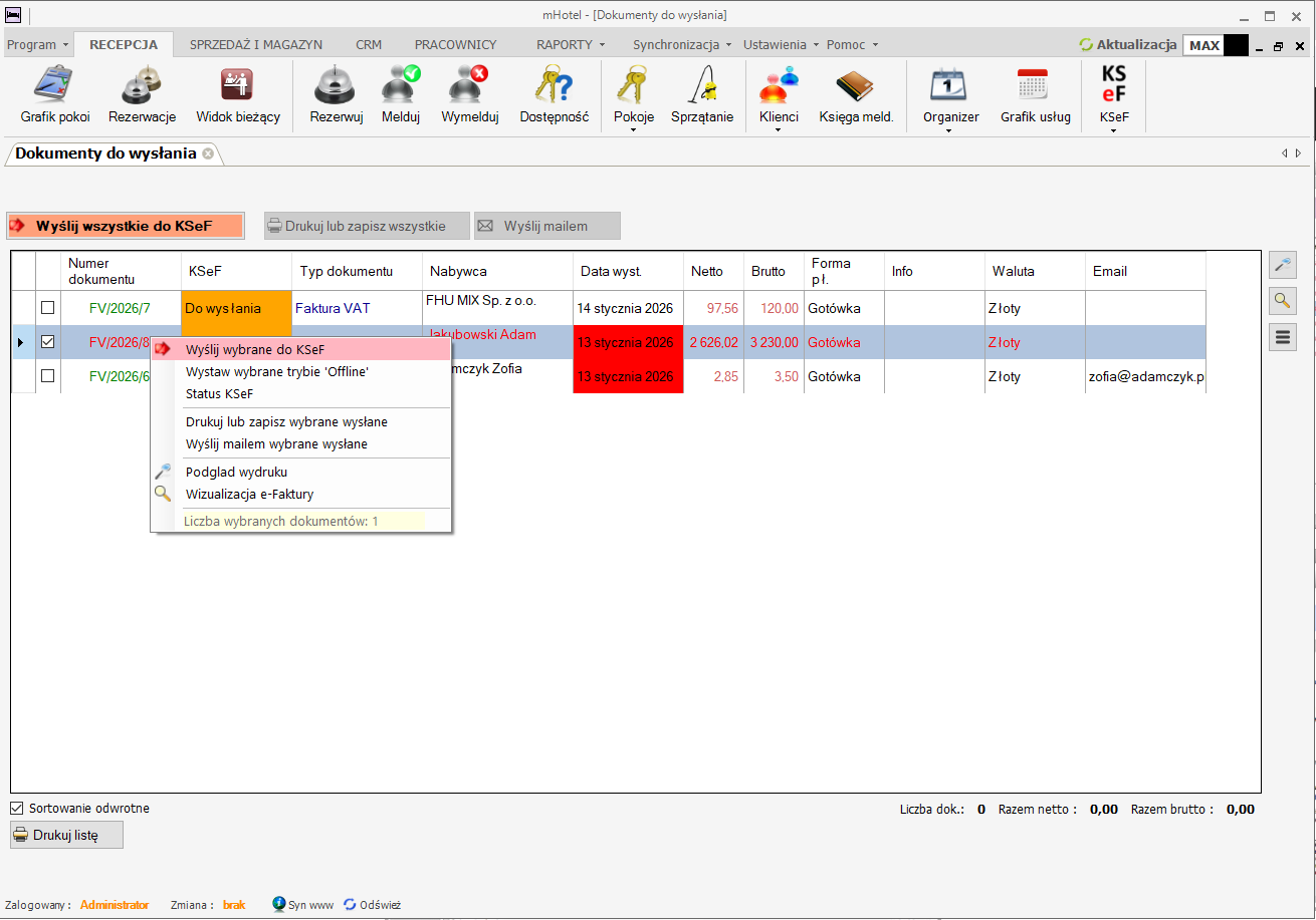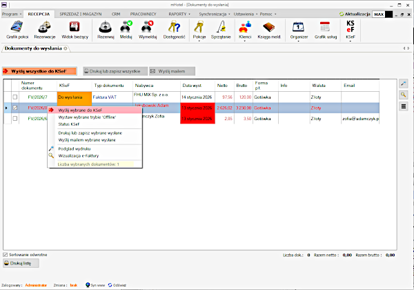 - po wysłaniu dokumentów do KSeF można je łatwo wysłać grupowo lub pojedynczo mailem, wydrukować, zapisać do pdf