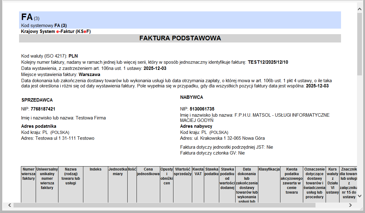 - pozwala zwizualizować dowolną fakturę z pełnymi informacjami, które zostaną lub zostały wysłane do KSeF,